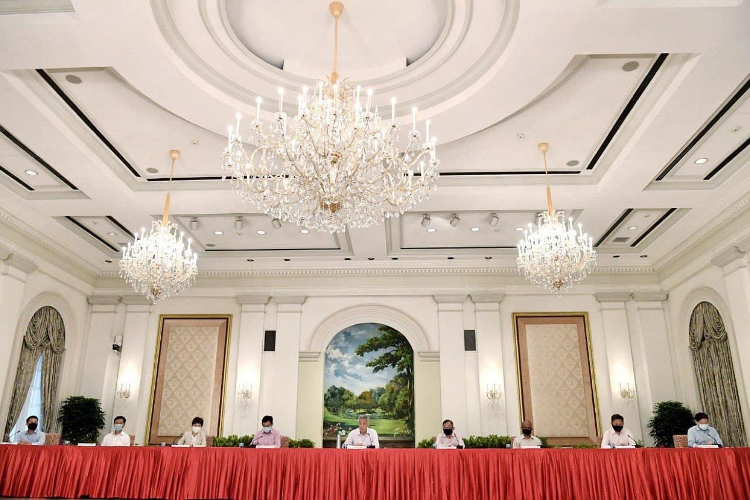 PM Lee Hsien Loong, DPM Heng Swee Keat and 4G Ministers at a press conference at the Istana on April 8, 2021.
