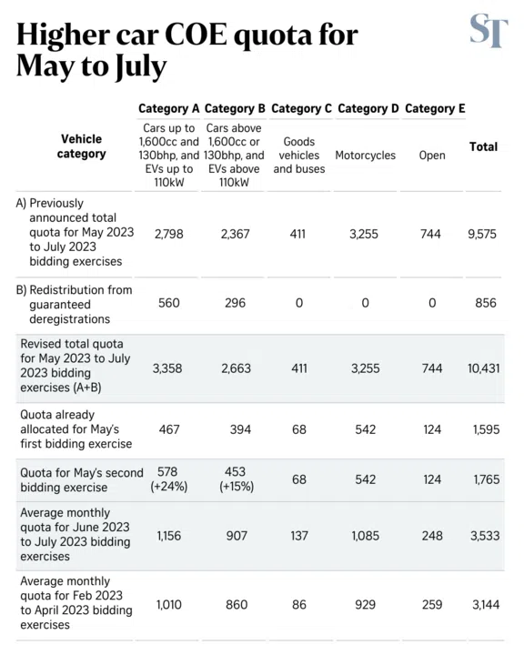 The car COE quota for May to July 2023 will be increased from 2,798 to 3,358 (Cat A) and 2,367 to 2,663 (Cat B).