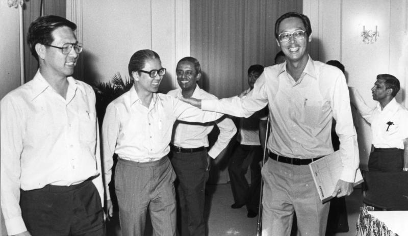 Mr Goh Chok Tong and some of his team members after the press conference on Dec 31, 1984.