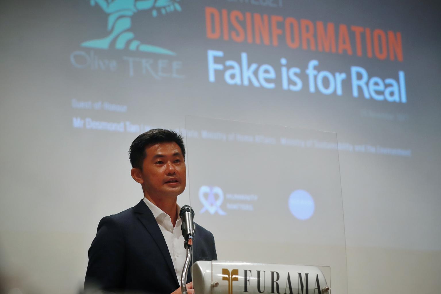 "Falsehoods can be exaggerated and sensational, baiting persons to pass on the falsehood to their own little social circles," said Mr Desmond Tan, Minister of State for Home Affairs, and Sustainability and the Environment.