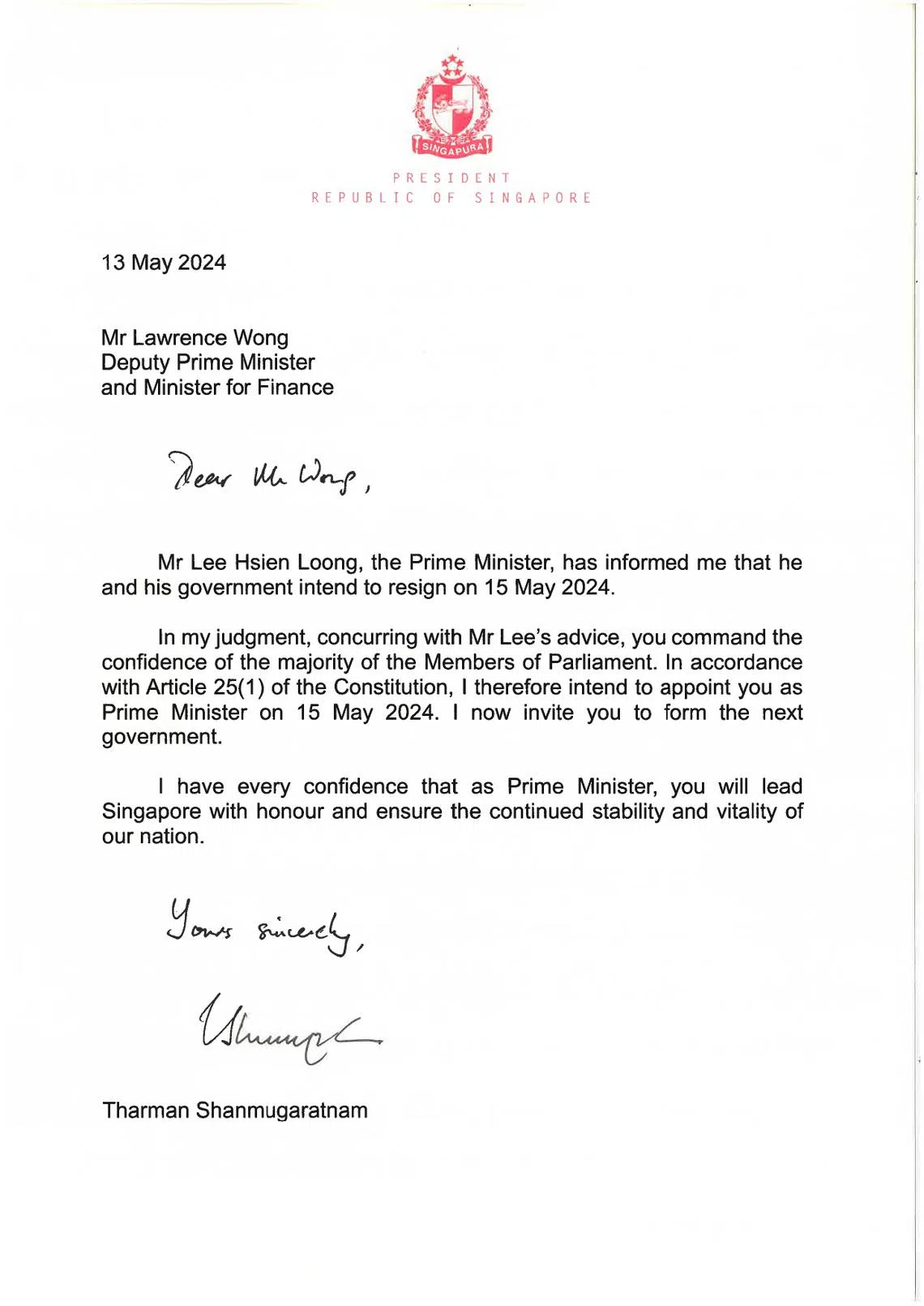In the exchange of letters, President Tharman, 67, noted that DPM Wong commanded the confidence of the majority of Members of Parliament.