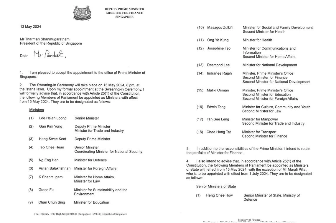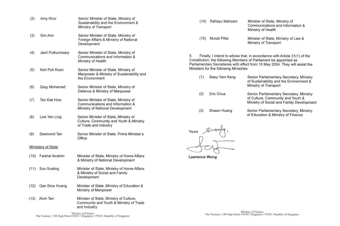 In his letter to President Tharman, DPM Wong listed the MPs who will become political office-holders with effect from May 15,