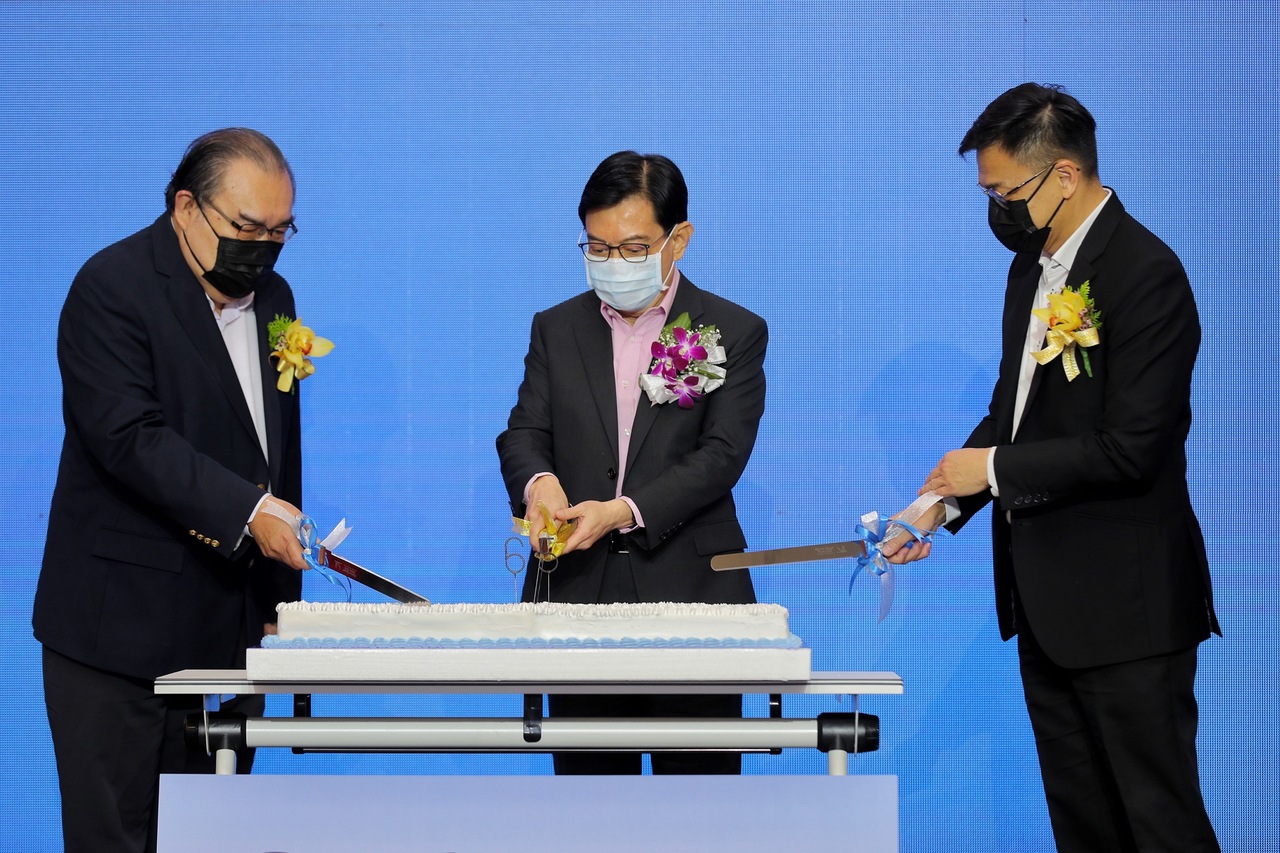 From left: Dunman High School’s 65th Anniversary Organising Committee Chairman Teo Kek Yeng, Deputy Prime Minister Heng Swee Keat and school principal Tony Low Teck Eng celebrating the school’s anniversary by cutting a cake, 9 Jul 2021.
