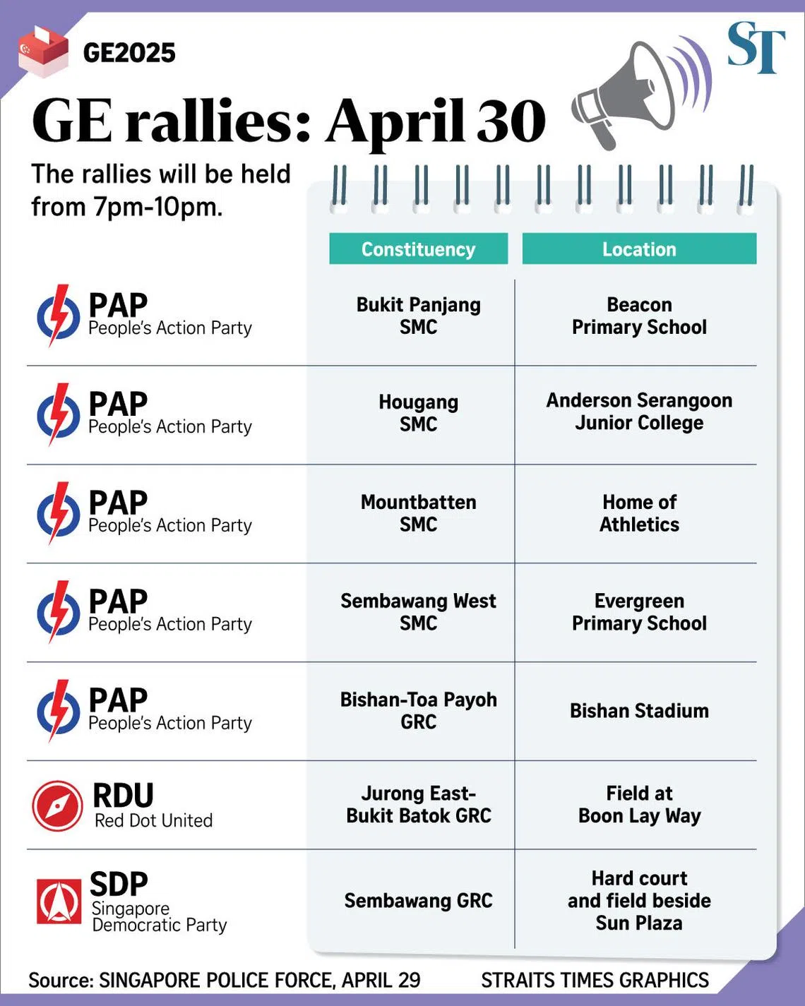 SINGAPORE – Seven election rallies are set to take place on April 30, just three days before about 2.75 million Singaporean voters head to the polls on May 3