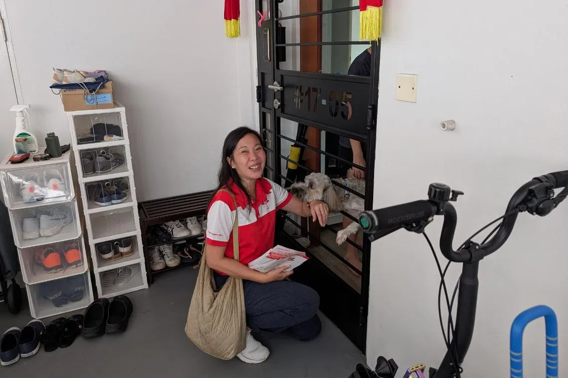 PSP's Wendy Low greeting residents during door-to-door visits at Keat Hong on April 29.