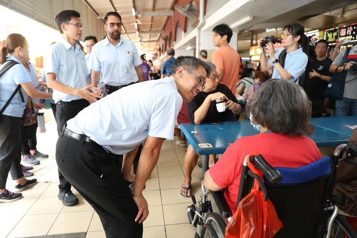 Mr Gerald Giam chatting with a member of the public at Kovan Market and Food Centre on April 26. With him are fellow Aljunied GRC candidates Kenneth tiong and Pritam Singh.