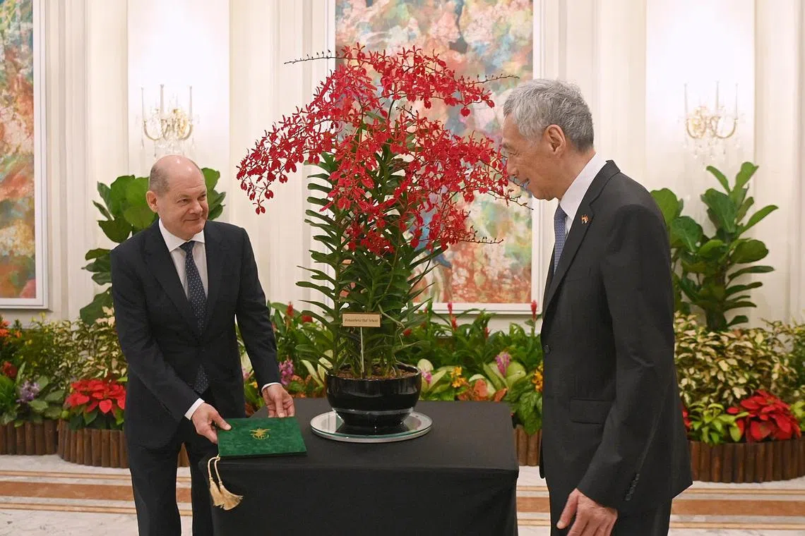 An orchid was also named in Mr Scholz’s honour at the Istana on Monday. In the evening, Mr Scholz was hosted to an official dinner by PM Lee.