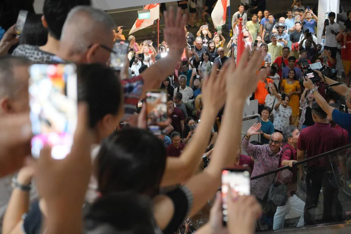 The excitement began building as the crowd grew, and when Mr Tharman, 66, turned up at about 10pm with his wife Jane Ittogi, 69, supporters lining the three floors of the hawker centre broke into chants of “ong lai” and “huat ah”.