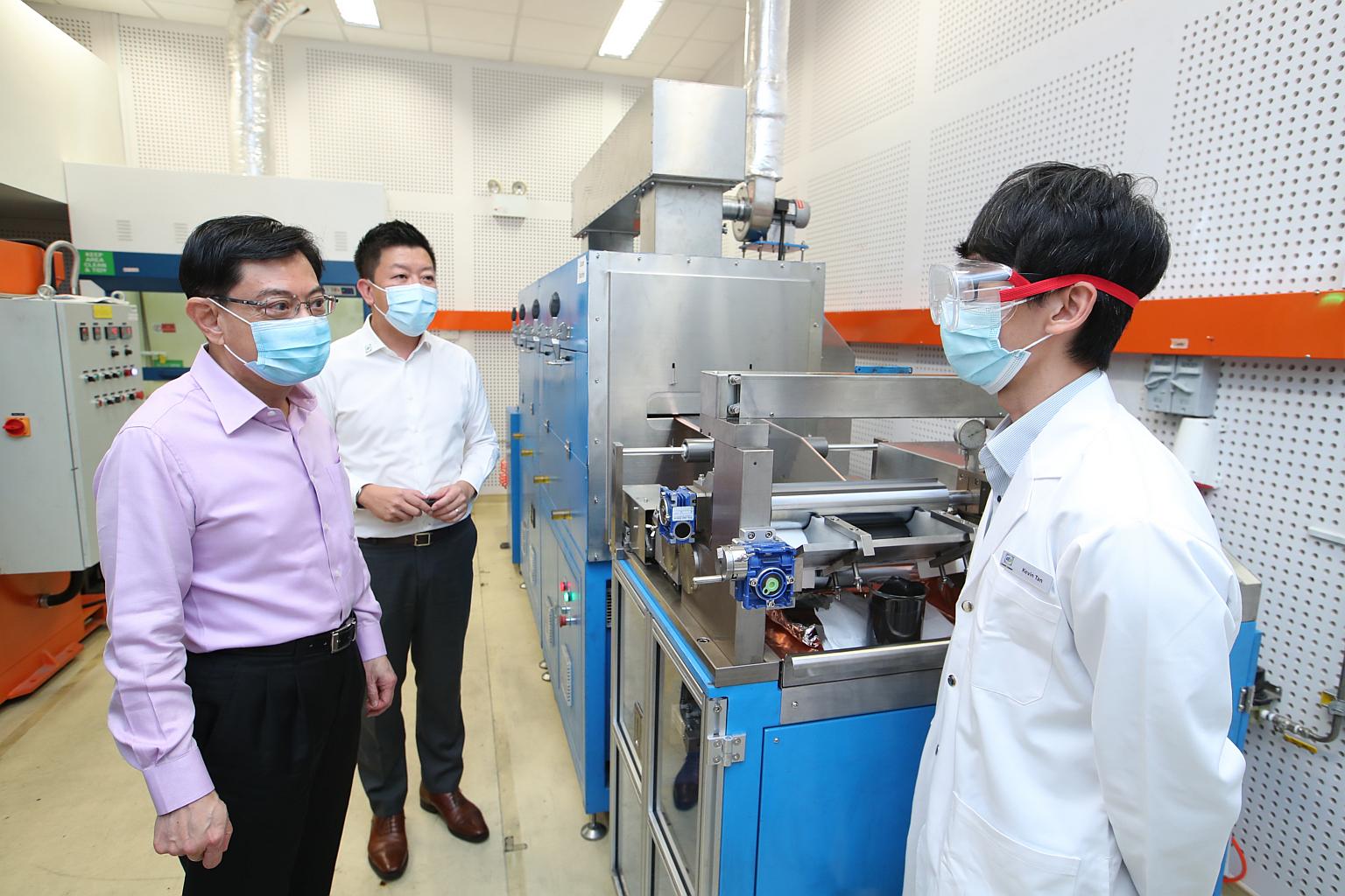 DPM Heng Swee Keat (left) being shown the fabrication process of lithium batteries by engineer Kevin Tan, during a visit to the Durapower R&D labs on Feb 5, 2021.
