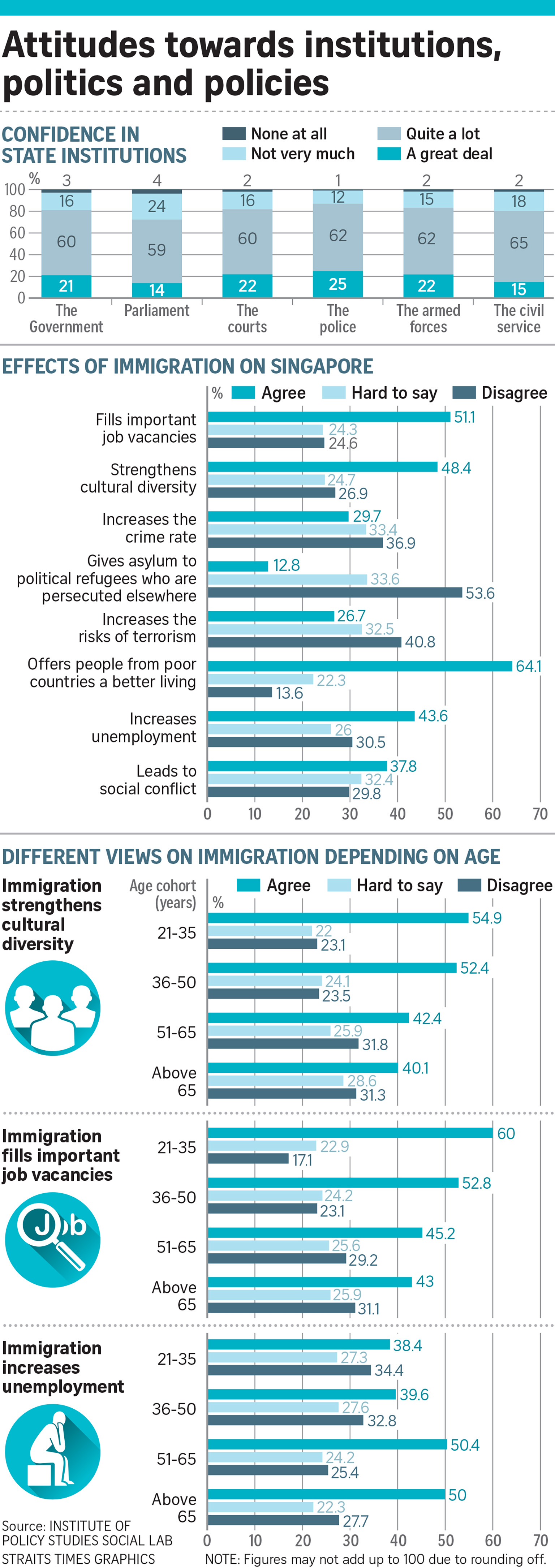 Their responses covered four areas: public confidence or trust in Singapore's institutions; political attitudes; attitudes towards government surveillance; and attitudes towards immigration.