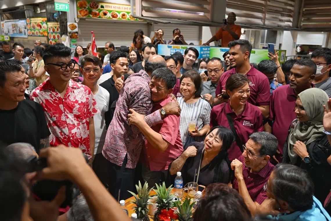 Mr Tharman hugging a supporter shortly before the release of the sample polling result at Taman Jurong Market and Food Centre on Sept 1.
