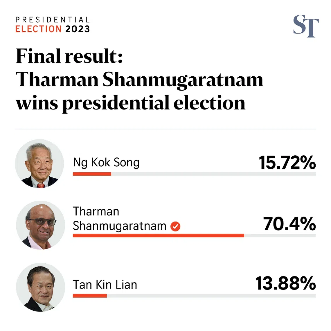In the presidential election on Friday, Mr Tharman, 66, secured 70.4 per cent of the vote while his fellow candidates Ng Kok Song and Tan Kin Lian, both 75, received 15.72 per cent and 13.88 per cent, respectively.