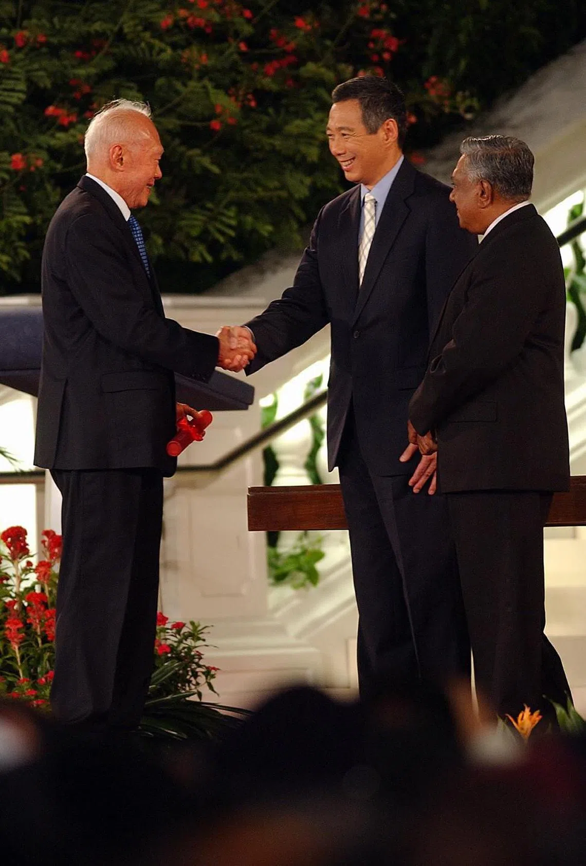 Newly sworn-in Prime Minister Lee Hsien Loong (centre) shakes hands with Singapore’s first PM, his father Lee Kuan Yew, who received his appointment as Minister Mentor from President S. R. Nathan, during the swearing-in ceremony at the Istana, on Aug 12, 2004.