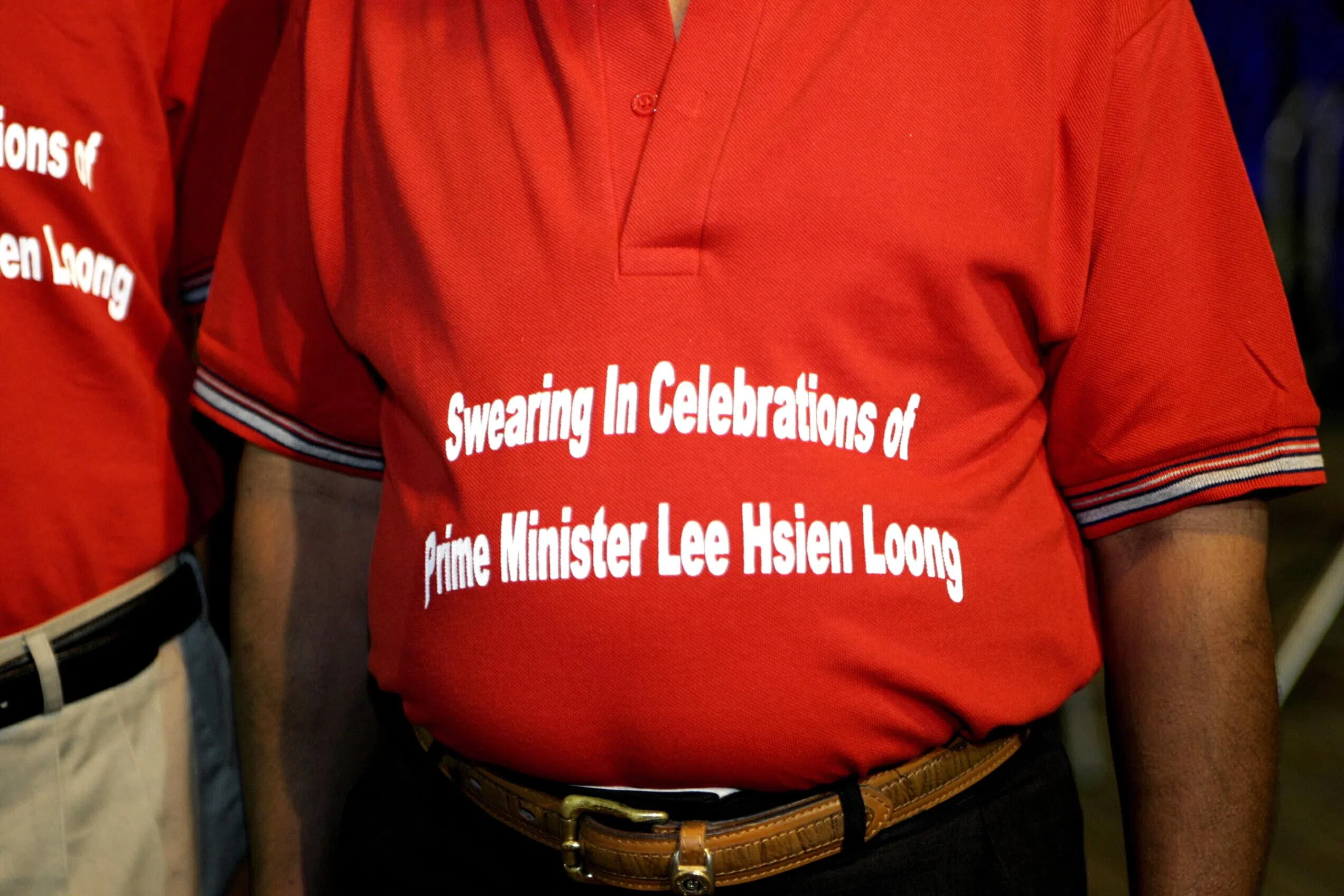 Grassroots members wear red T-shirts with the words “Swearing In Celebration Of Prime Minister Lee Hsien Loong”.