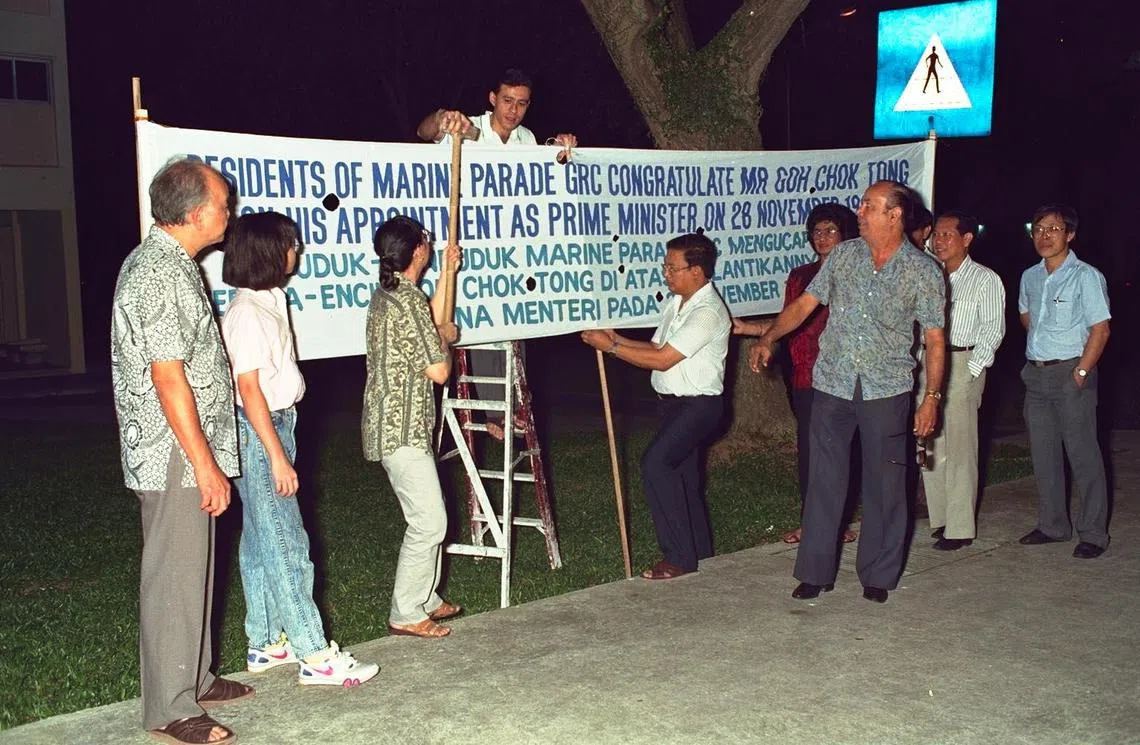 A banner is put up by the residents of Marine Parade GRC to congratulate their MP Goh Chok Tong on his appointment as the new prime minister of Singapore.