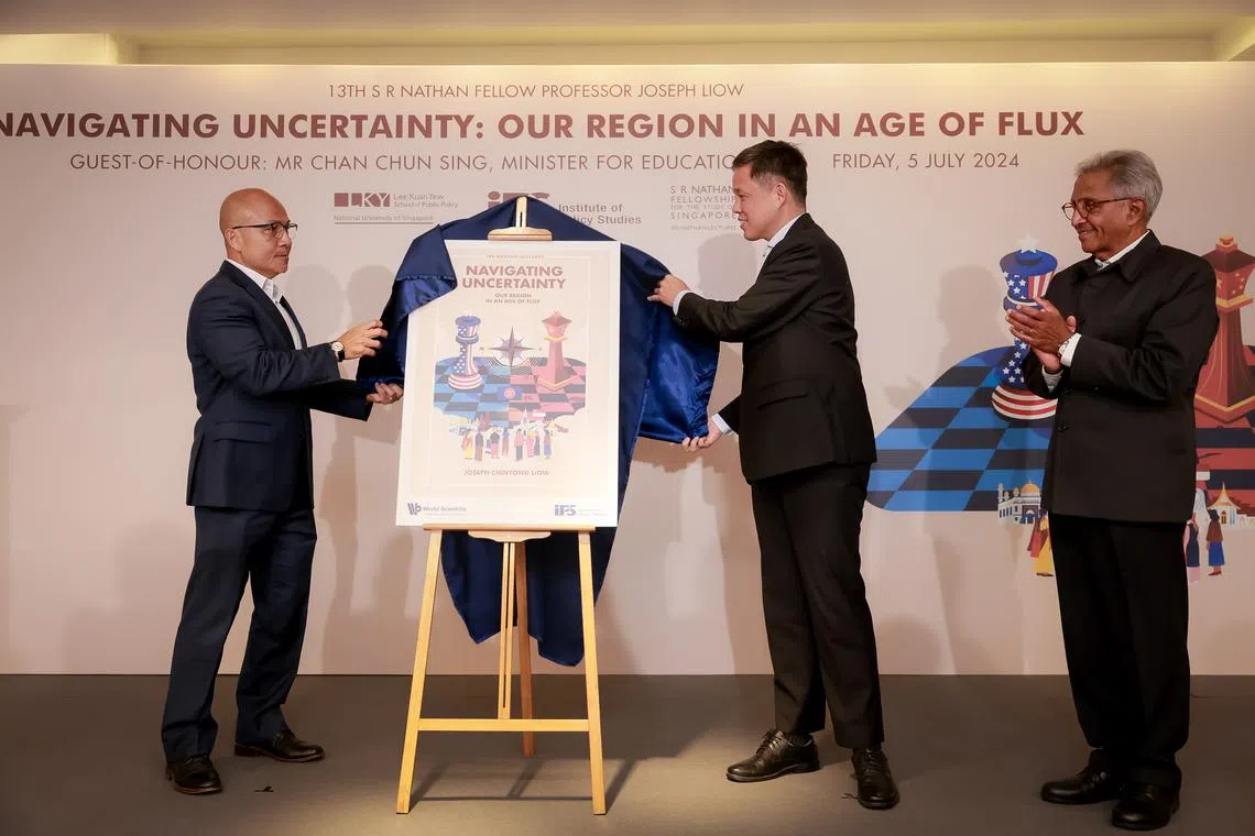 (From left) International affairs scholar Joseph Liow, Education Minister Chan Chun Sing and IPS director Janadas Devan unveiling the book Navigating Uncertainty: Our Region In An Age Of Flux by Prof Liow.