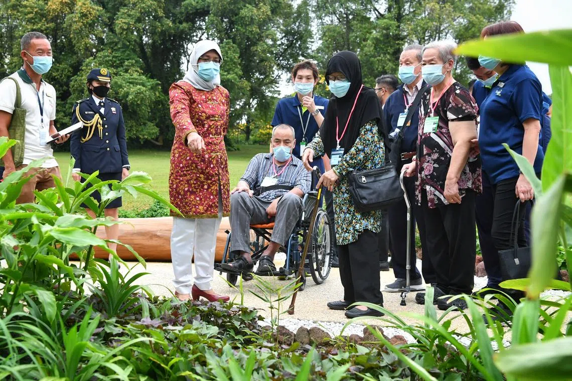 President Halimah Yacob with beneficiaries of the Cerebral Palsy Alliance Singapore and St Luke’s ElderCare on a tour of the Inclusive Garden during the Chinese New Year Istana Open House on Feb 10, 2021.