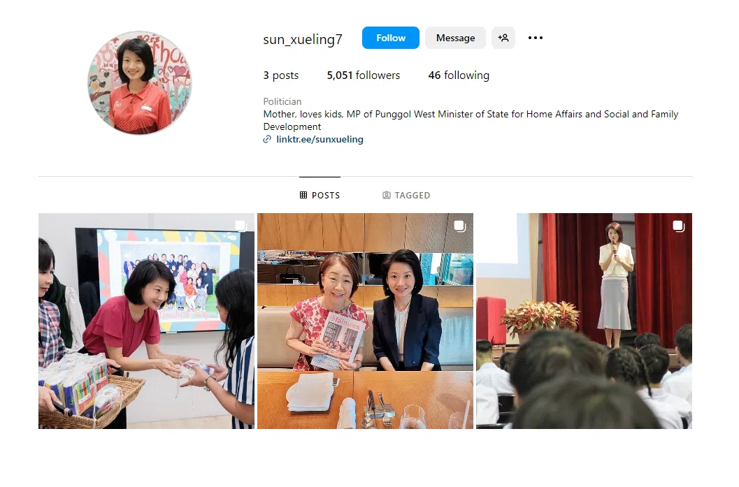 An Instagram account impersonating Minister of State for Home Affairs, and Social and Family Development Sun Xueling. This screengrab was taken on Sept 3, 2023.
