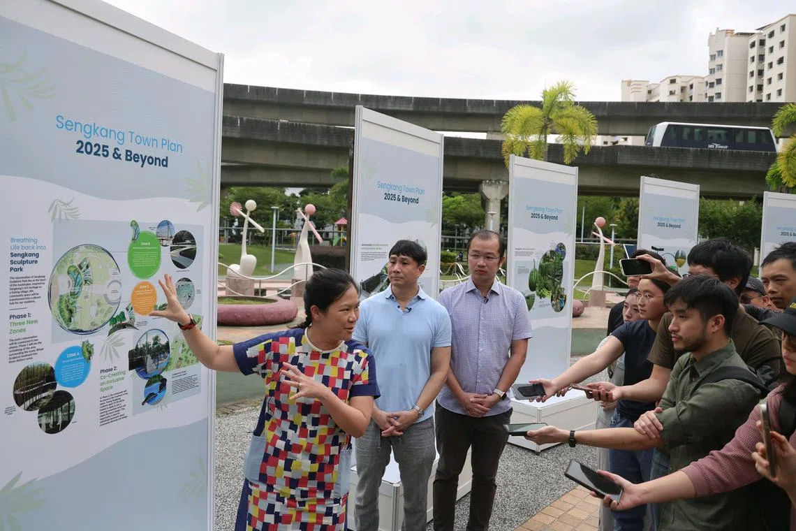 Sengkang GRC MPs (from left) He Ting Ru, Jamus Lim and Louis Chua introducing Sengkang Town Council’s five-year masterplan, which outlines upcoming projects for the town, on April 5.