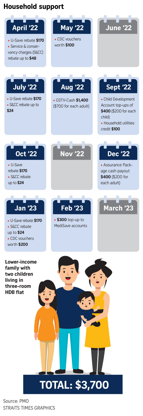 He cited the example of a married couple with two children living in a three-room HDB flat. They will receive support almost every month, amounting to $3,700 over 12 months that includes: