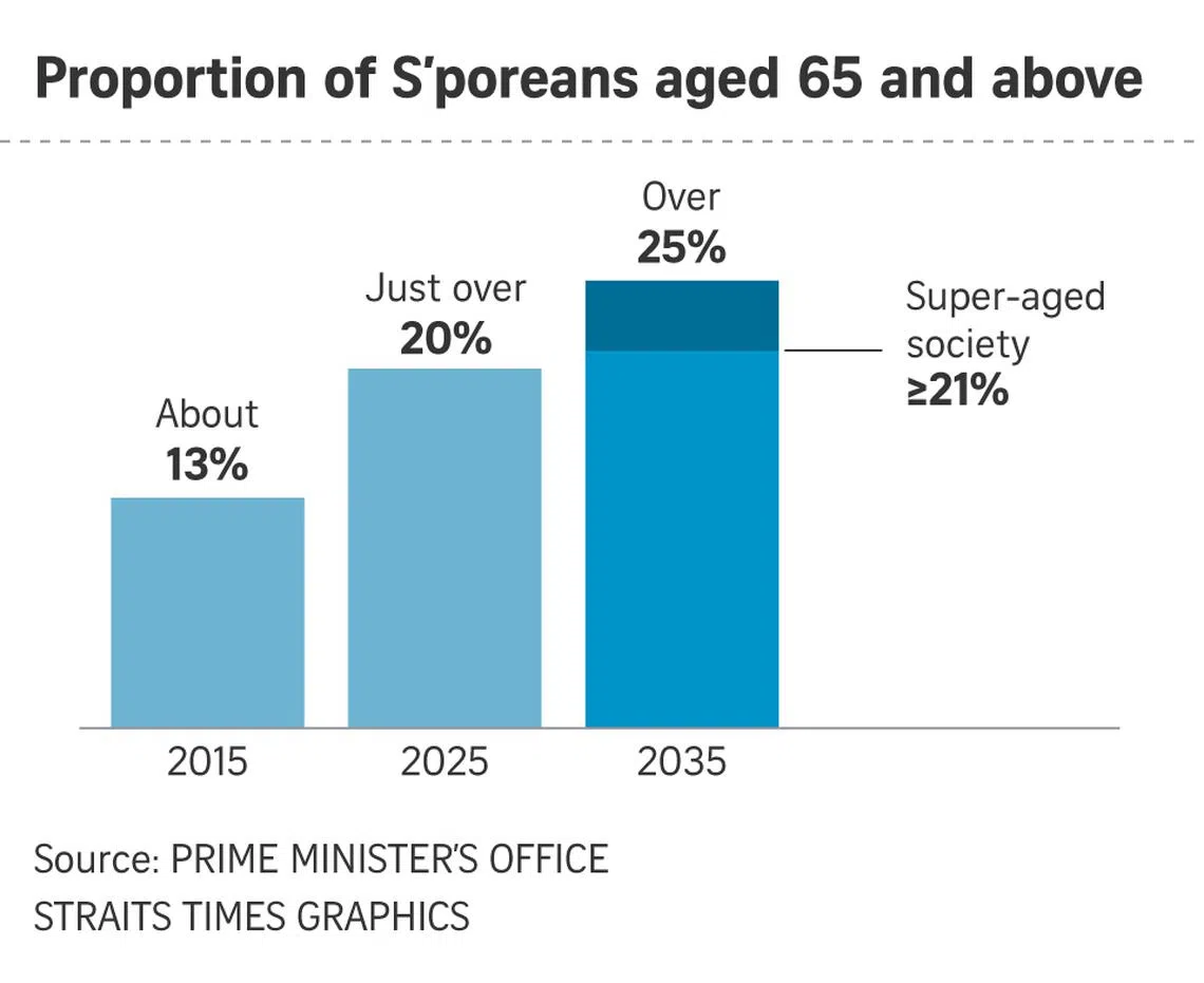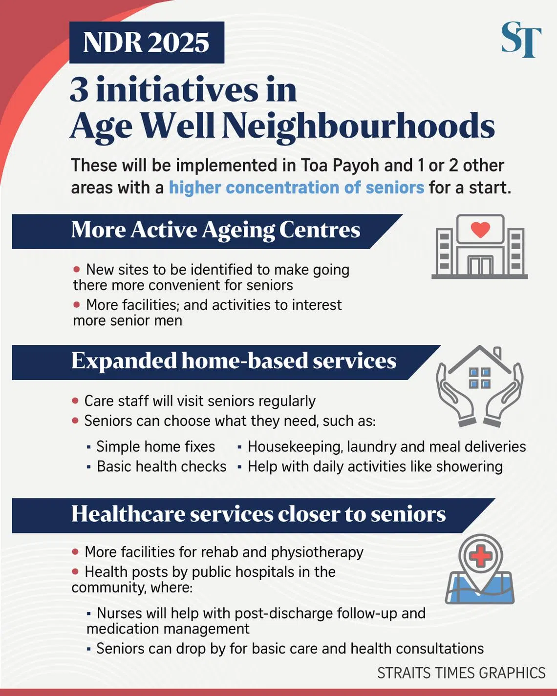 - Singapore will launch "Age Well Neighbourhoods" to support seniors who prefer to age at home, starting in Toa Payoh, where there is a high senior population.