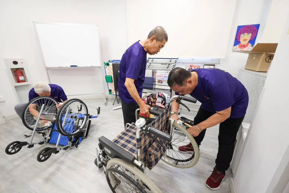 Seniors offering DIY repair services for wheelchairs at the Care Corner Active Ageing Centre in Toa Payoh.