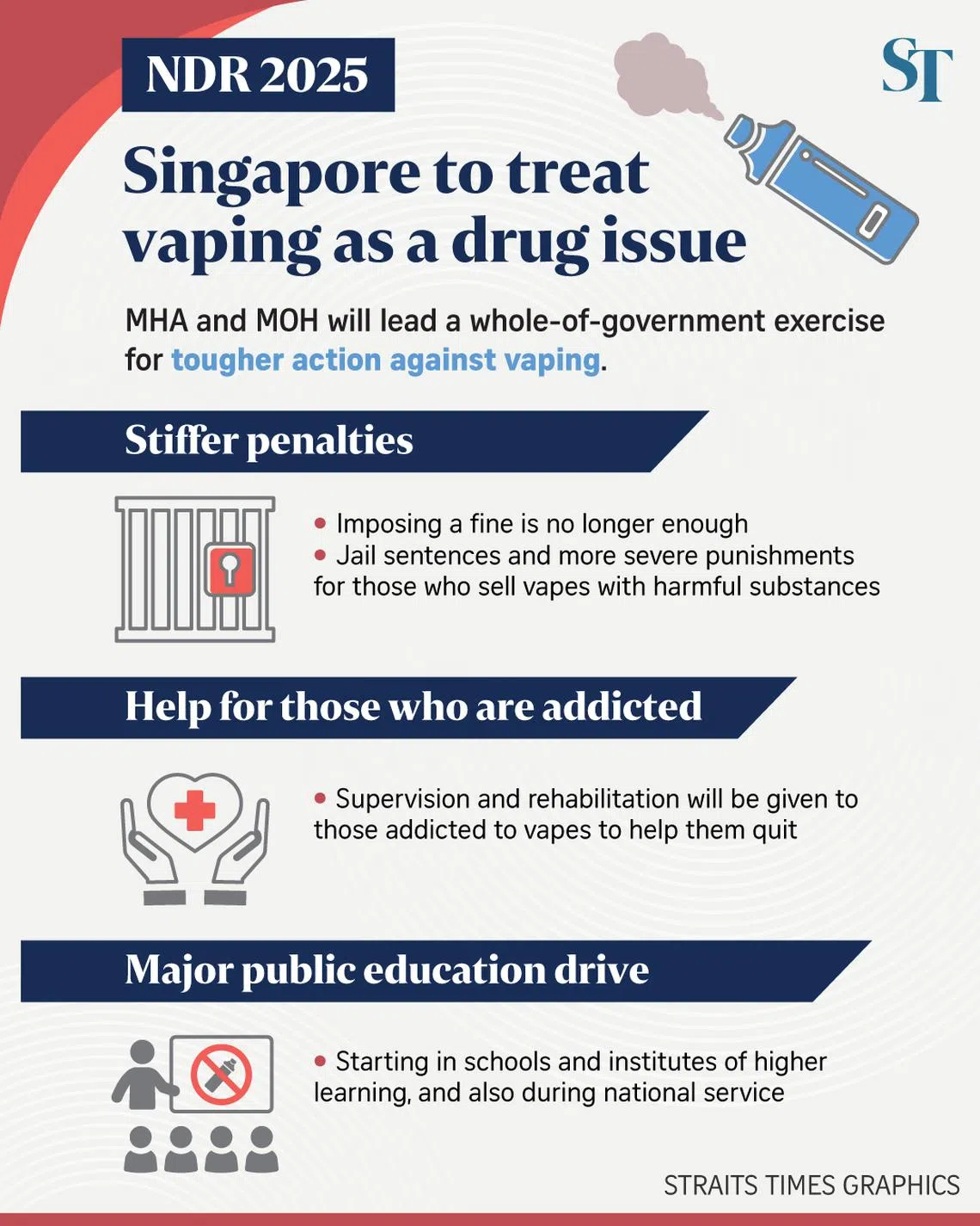 - Singapore will toughen its stance on vaping, treating it as a drug issue with harsher penalties including jail for sellers of vapes with harmful substances.