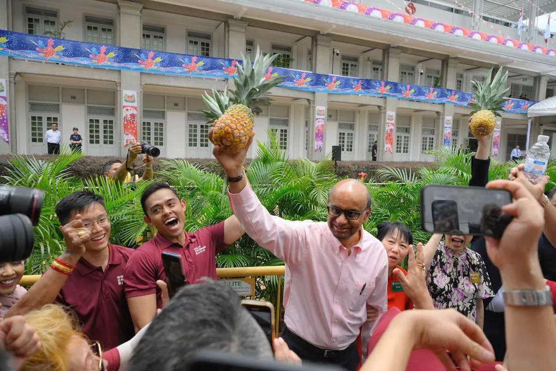 Mr Tharman Shanmugaratnam holds up a pineapple in front of his supporters at the nomination centre on Aug 22.