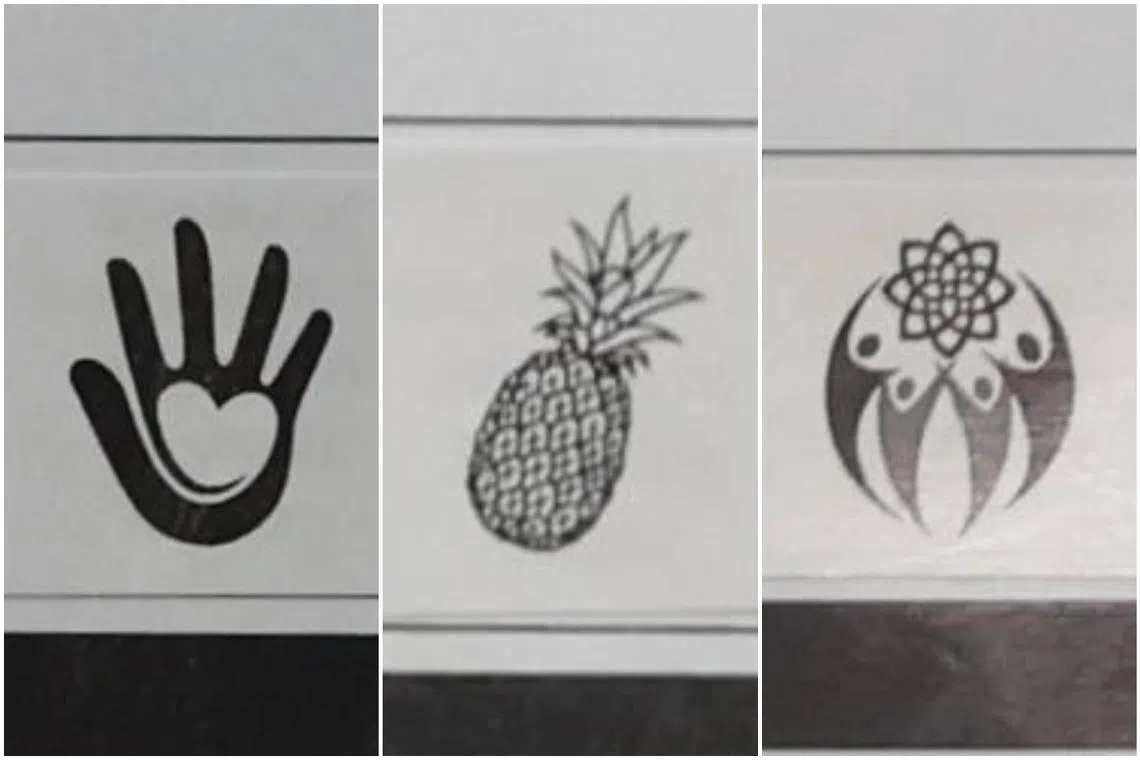 Mr Ng’s symbol is the palm of a hand with a heart within it. Mr Tharman’s is a pineapple, while Mr Tan’s depicts four people holding up a flower.