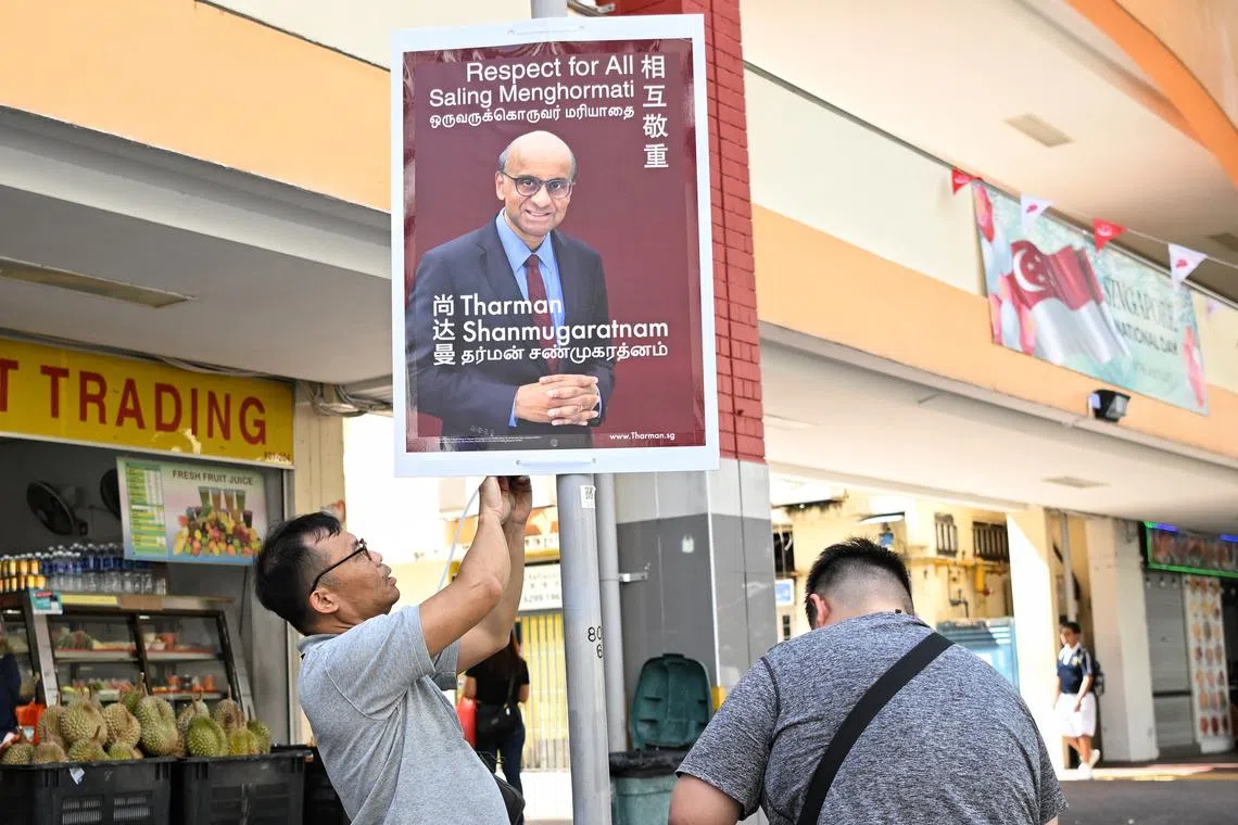 Posters of presidential candidate Tharman Shanmugaratnam being put up in Jalan Besar on Tuesday.