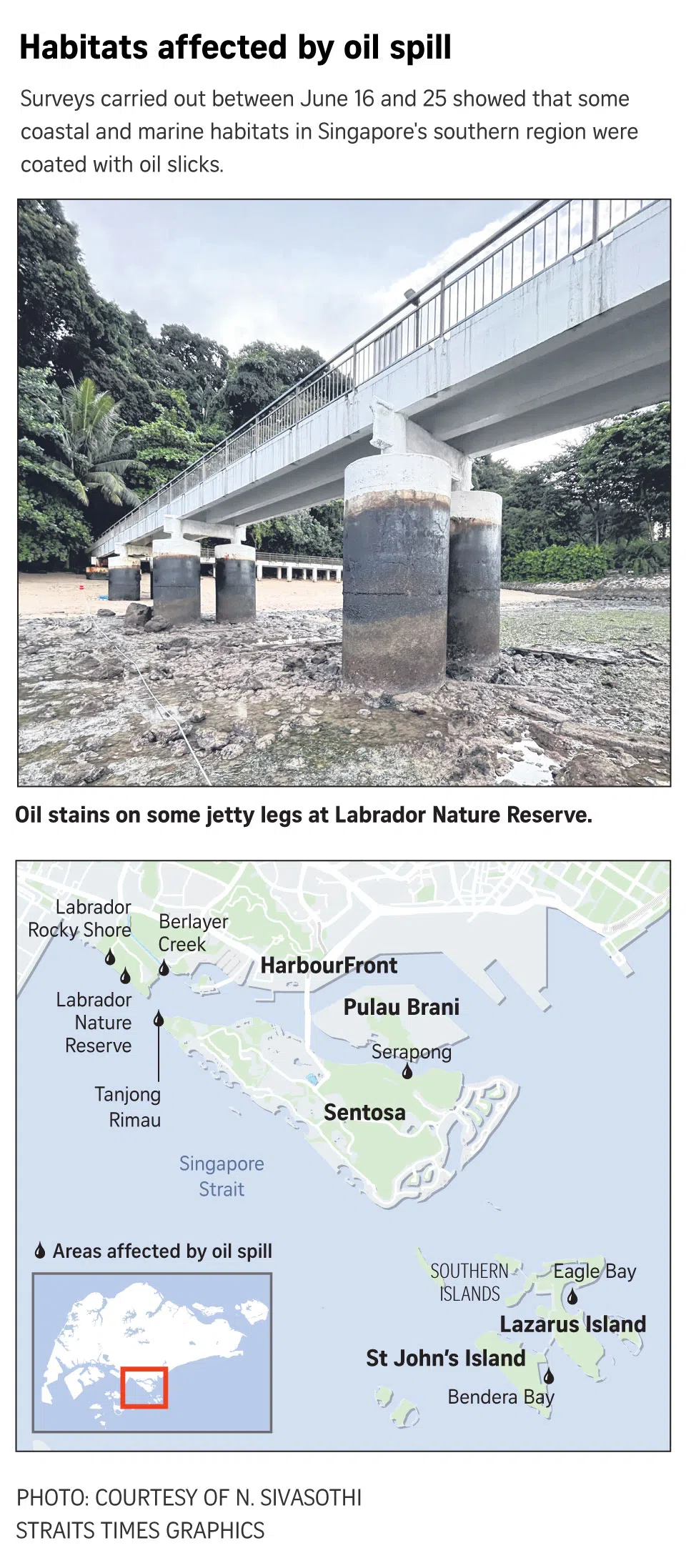 Mr N. Sivasothi, a senior lecturer at the National University of Singapore (NUS) who surveyed Labrador Nature Reserve on June 25, said the lower parts of the reserve’s rocky shore were not smothered by the oil slick as the area was submerged during higher tides on June 14.
