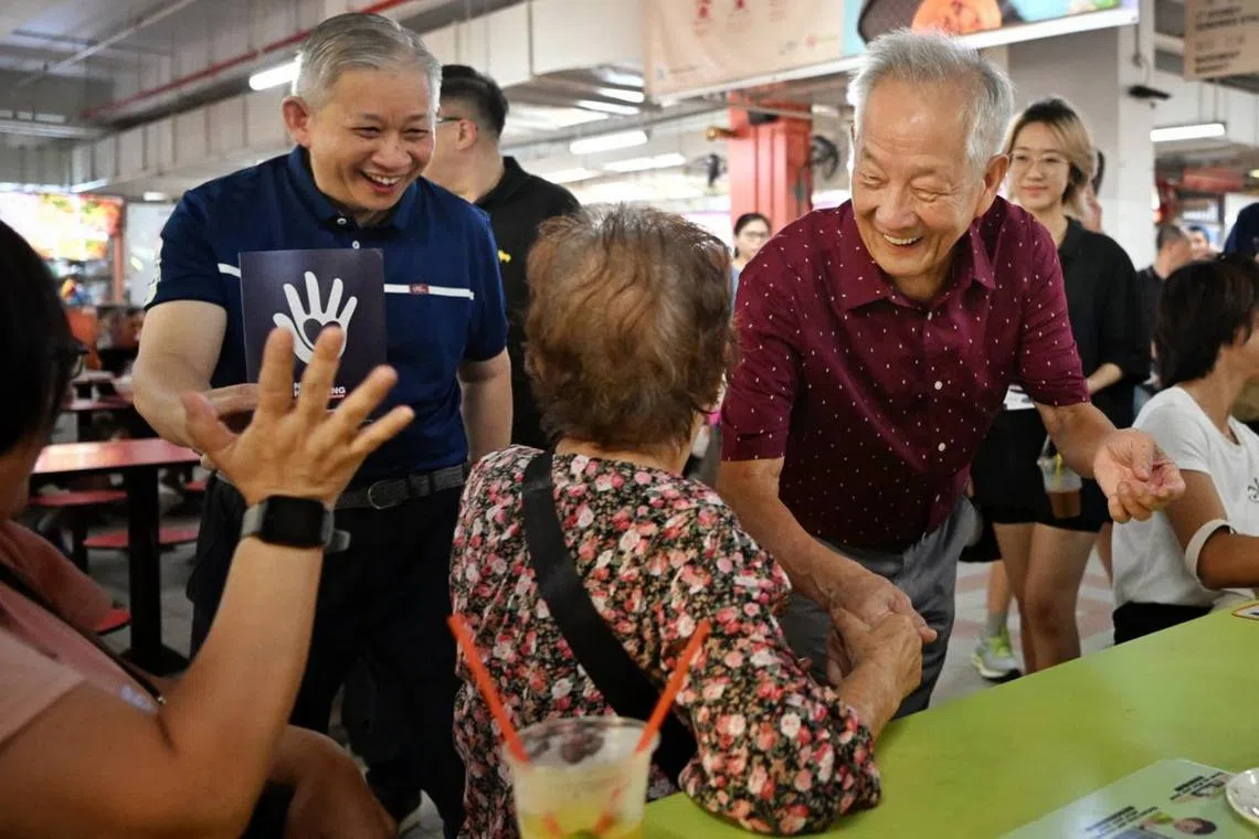 Mr Ng Kok Song greeting patrons and handing out flyers at Chinatown Complex on Aug 27.