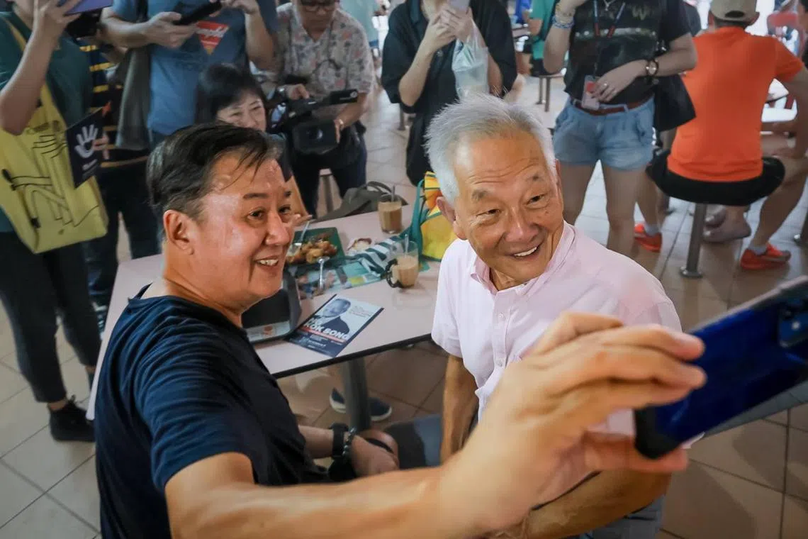 Mr Ng Kok Song taking a selfie with a patron at Tampines Round Market and Food Centre during his walkabout on the morning of Aug 27.