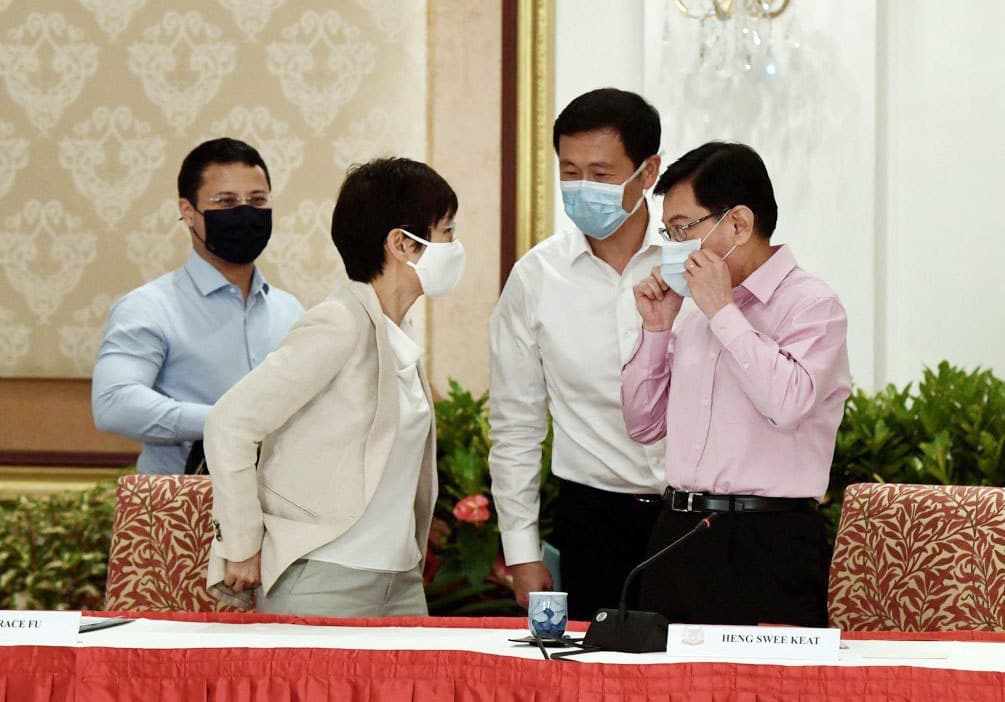 Deputy Prime Minister Heng Swee Keat with ministers (from left) Desmond Lee, Grace Fu and Ong Ye Kung during a press conference at the Istana on April 8, 2021.