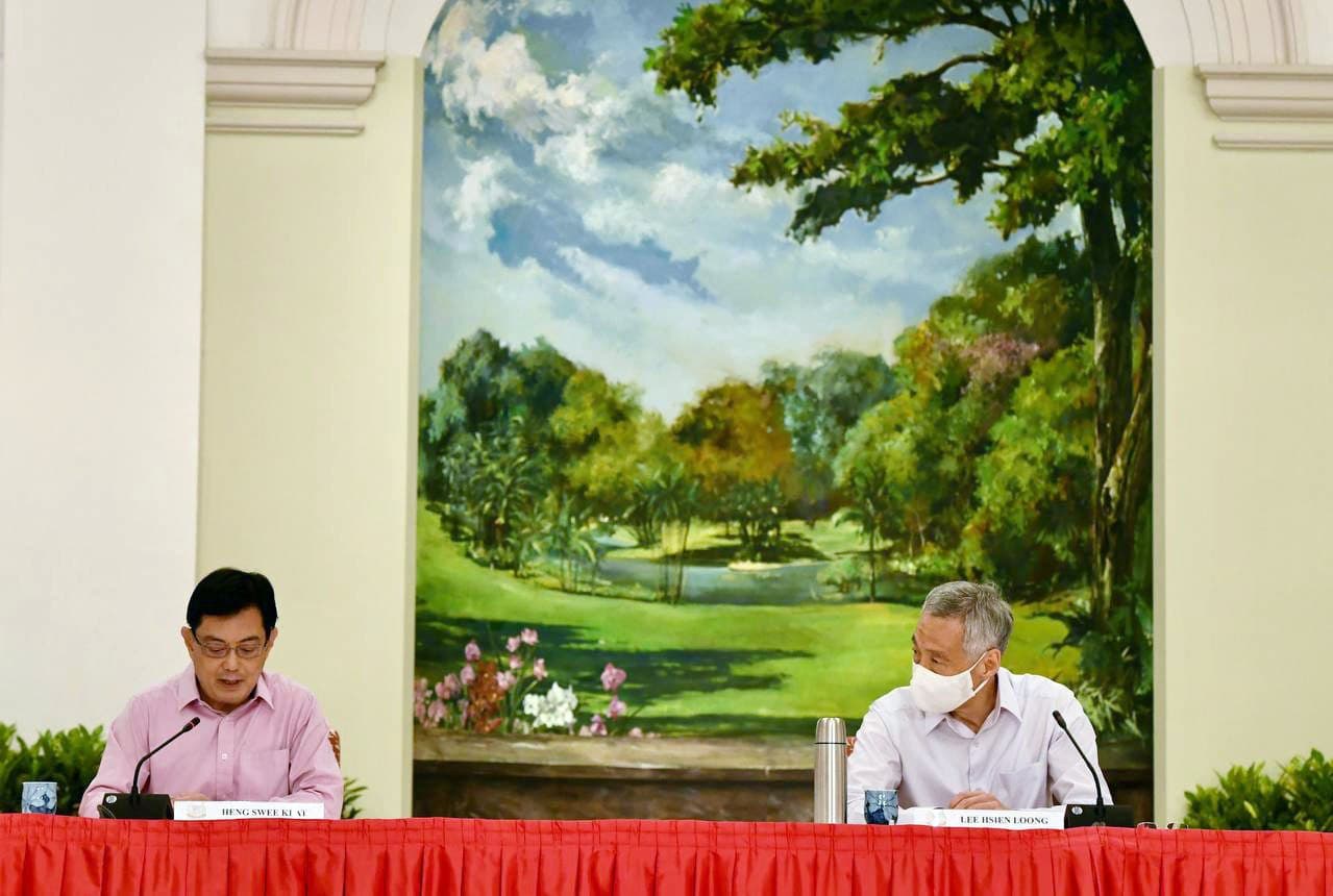 Prime Minister Lee Hsien Loong and Deputy Prime Minister Heng Swee Keat at a press conference at the Istana on April 8, 2021.