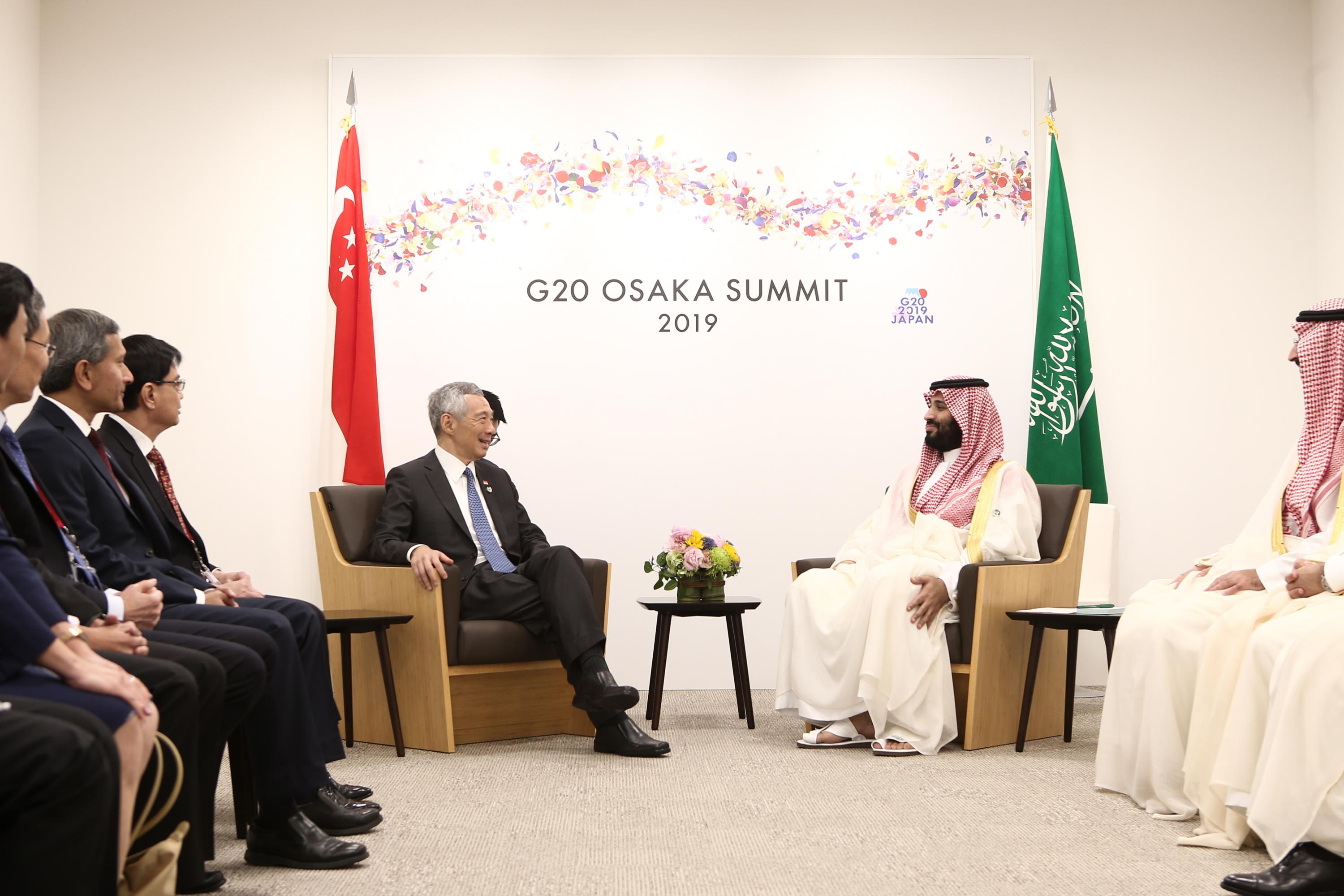 Prime Minister Lee Hsien Loong (left) meets Saudi Arabia’s Crown Prince Mohammed bin Salman in Osaka, on June 28, 2019.