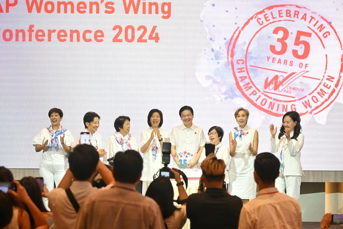 Prime Minister Lawrence Wong with (from left) Minister Indranee Rajah, Minister Grace Fu, former PAP Women's Wing chairwoman Lim Hwee Hwa, Senior Minister of State Sim Ann, former PAP Women's Wing chairwoman Aline Wong, Minister Josephine Teo and Ms Rachel Ong, organising chairwoman of the PAP Women's Wing conference.