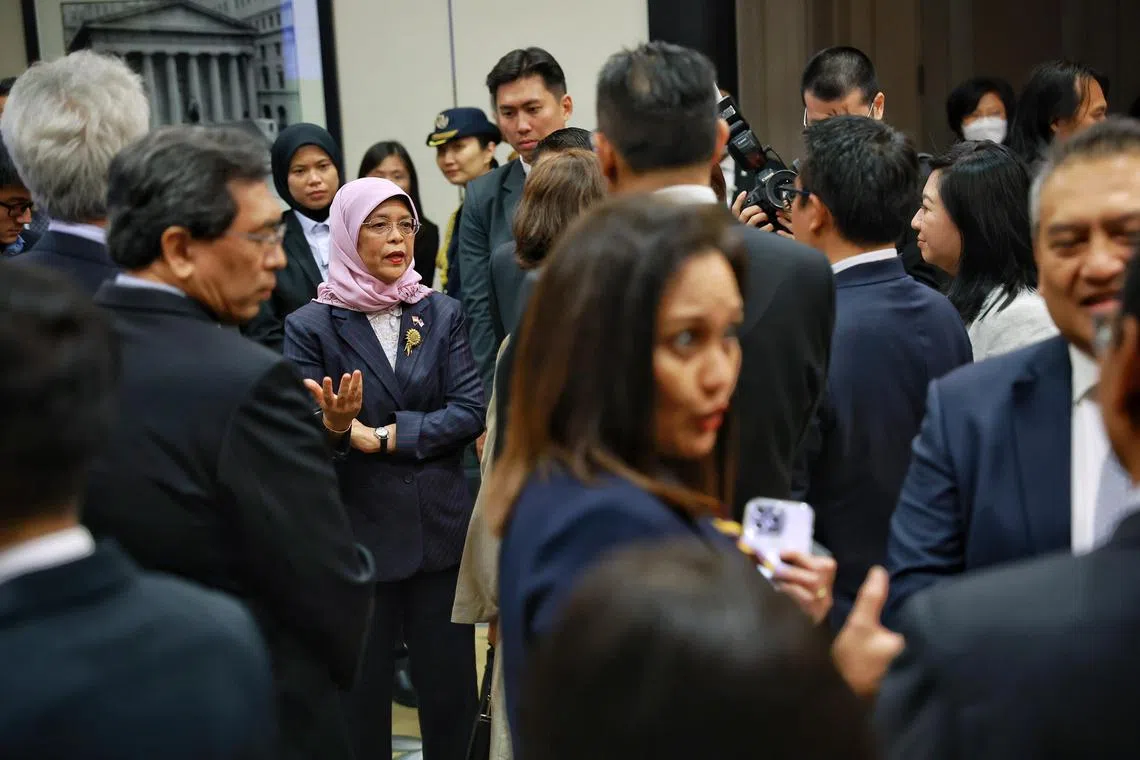 President Halimah Yacob, accompanied by her husband Mohammed Abdullah Alhabshee, speaking with members of the Singapore community at the St Regis Kuala Lumpur on March 20, 2023.