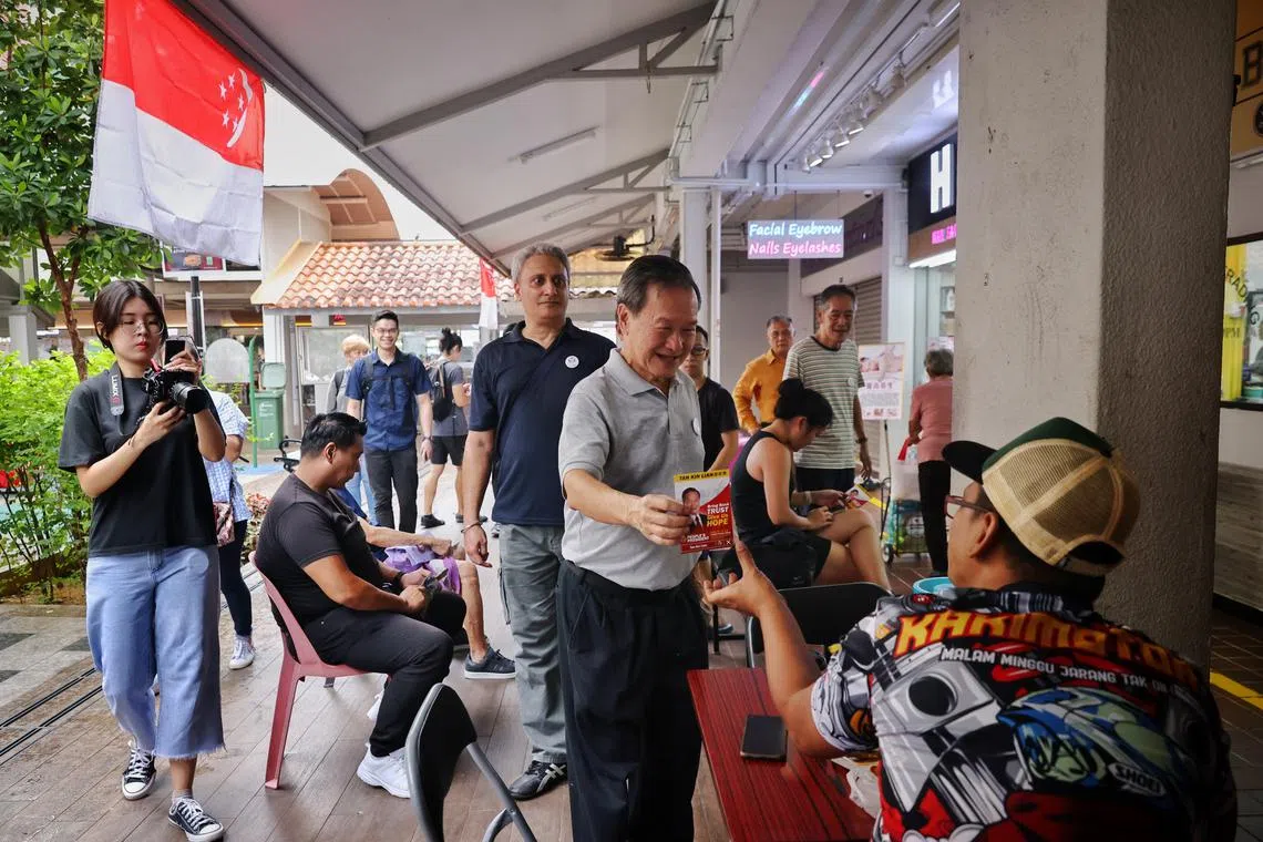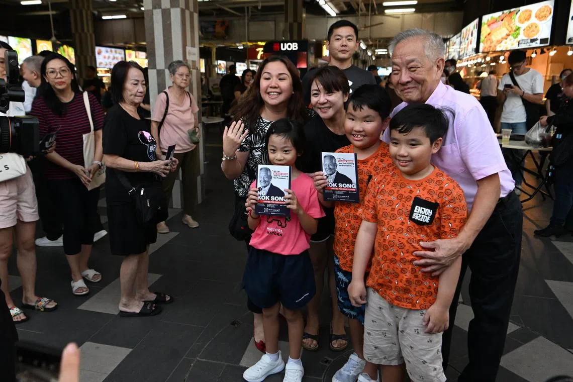 Presidential candidate Ng Kok Song with patrons during a walkabout at Kopitiam Square in Sengkang on Wednesday.