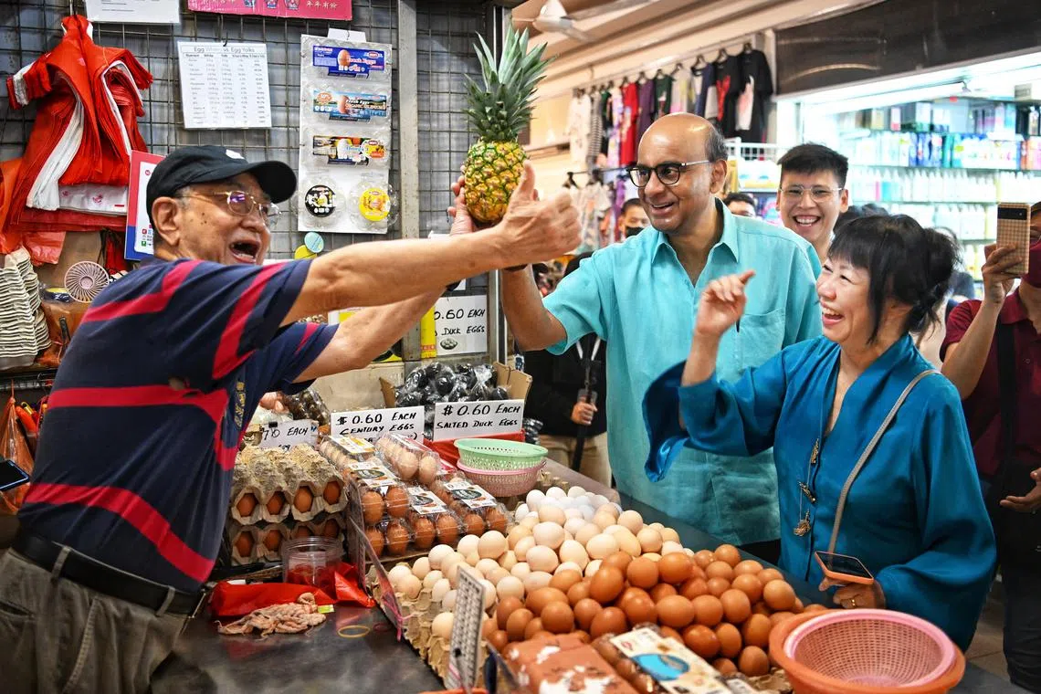 Meanwhile, Mr Tharman visited Tiong Bahru Market, where he was swarmed by residents and stallholders who wanted pictures with him and his wife, Ms Jane Ittogi, 69.