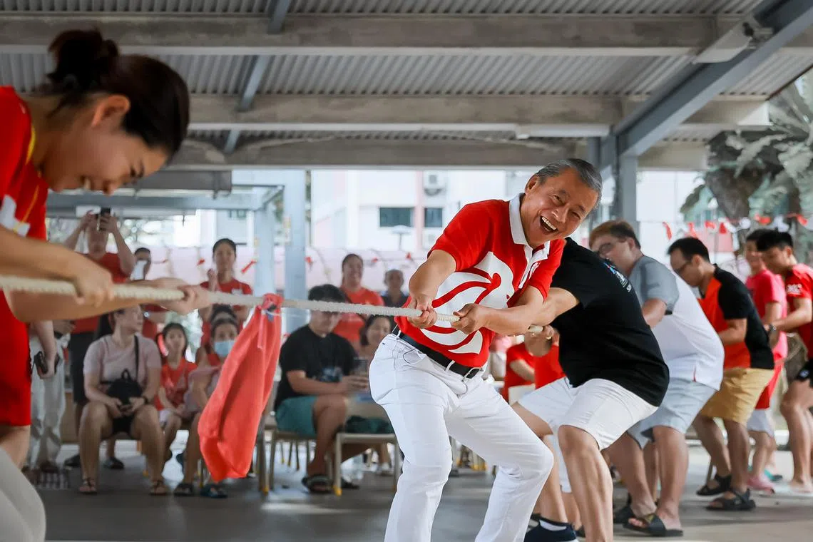 Mr George Goh playing a game of tug-of-war with school staff and parents during Ang Mo Kio Presbyterian Preschool’s National Day celebration on Aug 8, 2023.