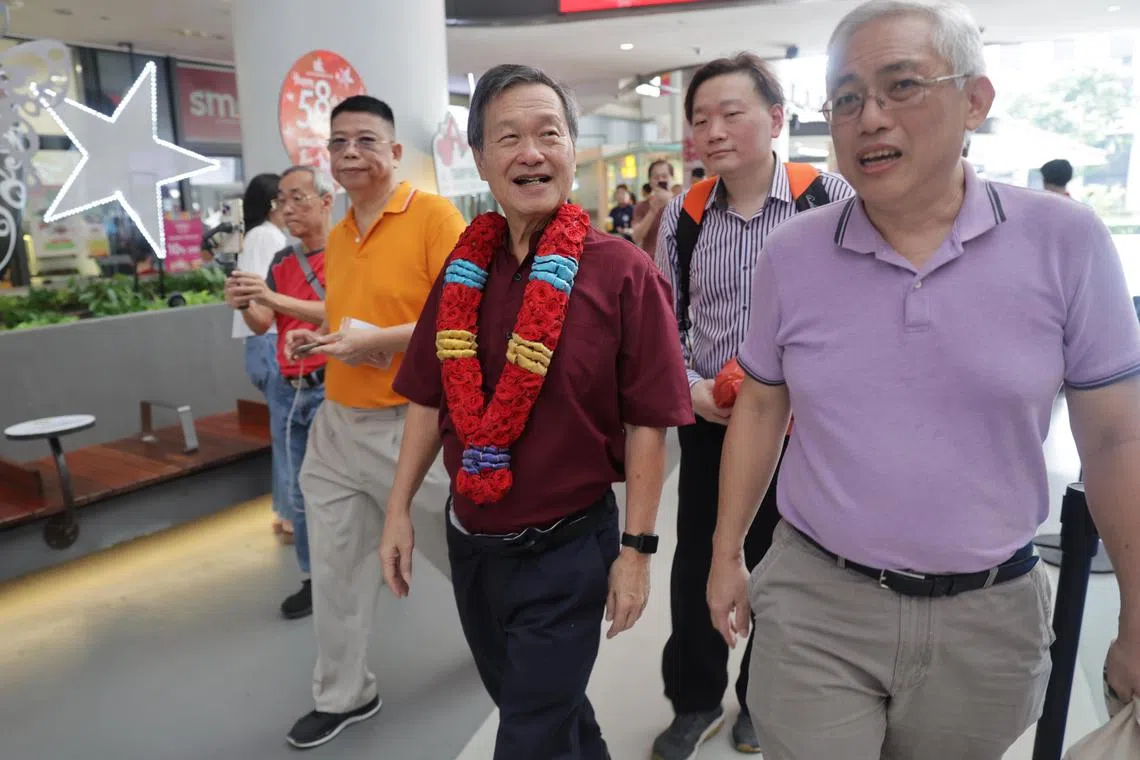 Mr Tan Kin Lian and his team during his first walkabout on Aug 12 at Our Tampines Hub, where he greeted residents and spoke with stall vendors.