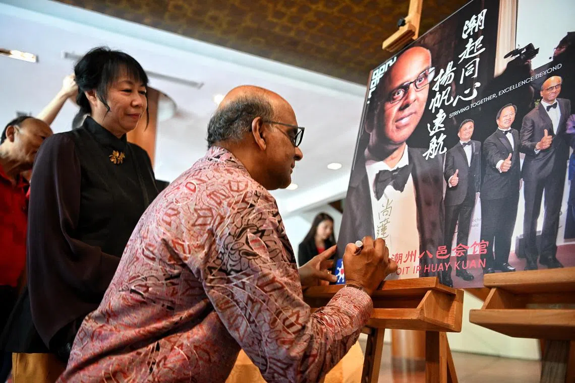 Mr Tharman Shanmugaratnam, with his wife Jane Ittogi, signing a poster before taking part in a dialogue at the Teochew Poit Ip Huay Kuay on Aug 12, 2023.