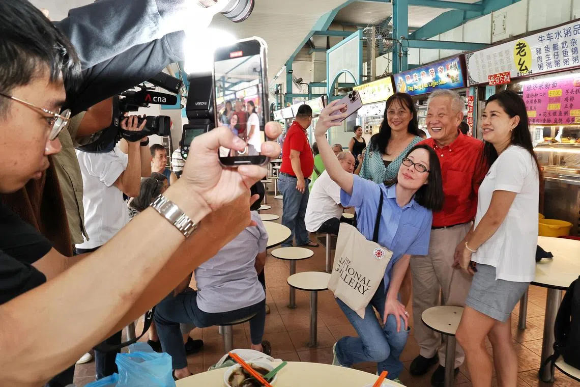 Mr Ng Kok Song and his fiancee Sybil Lau (in blue top) taking a wefie with residents while on a walkabout at The Marketplace@58 in New Upper Changi Road on Aug 11, 2023.