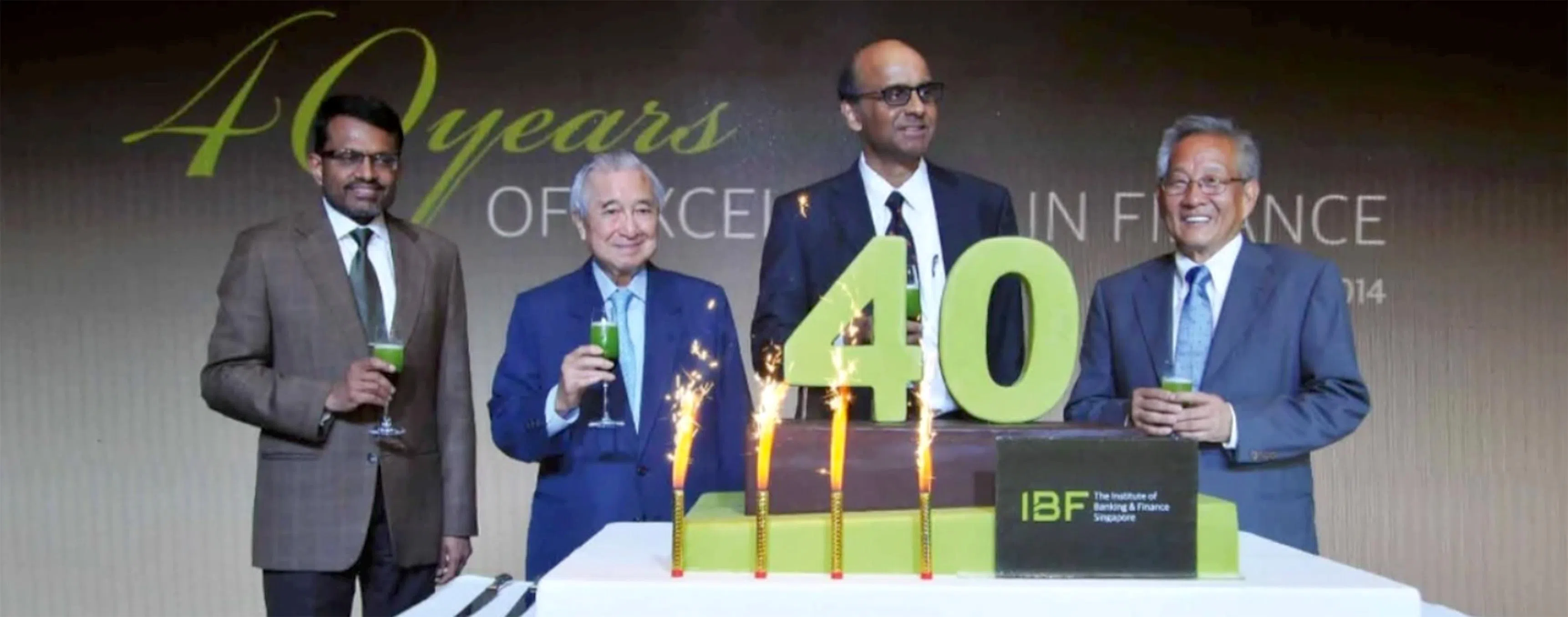 Mr Ng Kok Song (right) with then DPM Tharman Shanmugaratnam (second right) during a toast by current and former Institute of Banking and Finance Singapore chairmen at the 40th anniversary celebration in 2014. With them are IBF chairman Ravi Menon (left) and former chairman Michael Wong Pakshong.