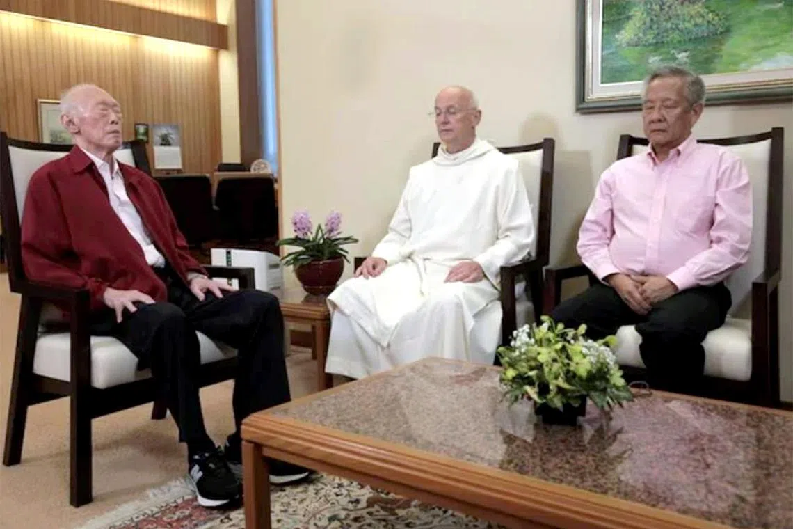 (From left) The late Minister Mentor Lee Kuan Yew, Benedictine monk Laurence Freeman and Mr Ng Kok Song meditating. Mr Ng made headlines about 15 years ago for teaching MM Lee how to meditate.