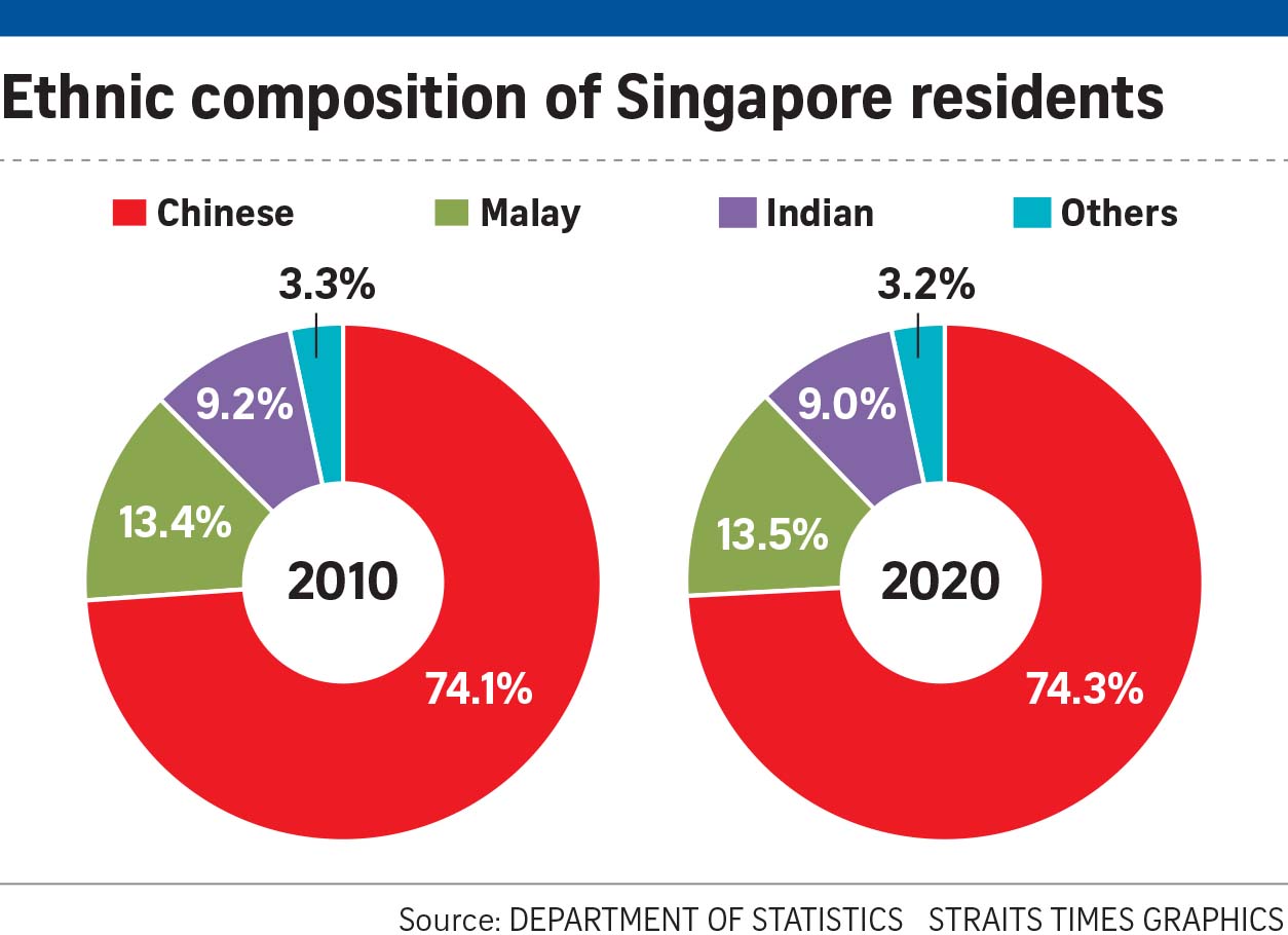 The census is conducted every decade by the Department of Statistics. Its latest findings showed that the ethnic composition of the resident population has remained stable - with 74.3 per cent Chinese, 13.5 per cent Malays and 9 per cent Indians.