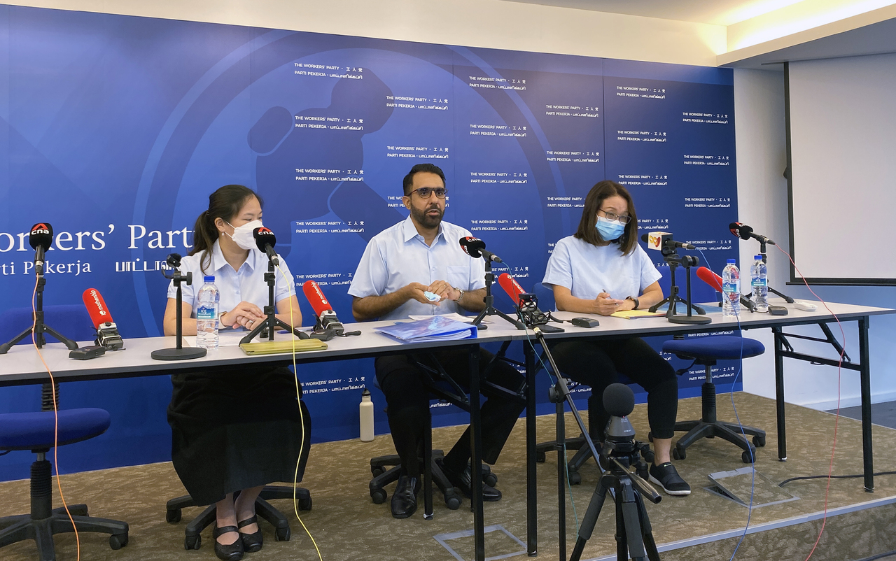 WP chief Pritam Singh with Sengkang GRC MP He Ting Ru (left) and party chairman Sylvia Lim at a press conference on Dec 2, 2021.