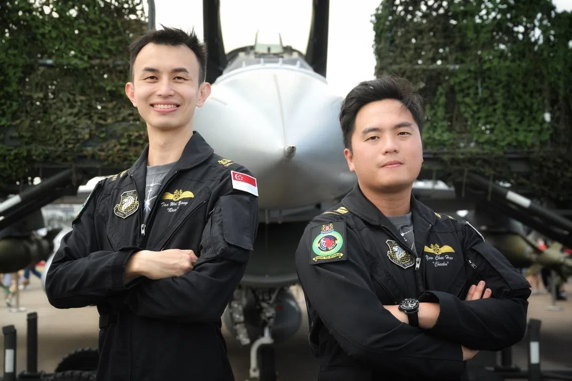 F-16 pilot Tan Wei Yang (left) and AH-64D Apache pilot Yew Chee Hao are out to impress in the RSAF aerial display.