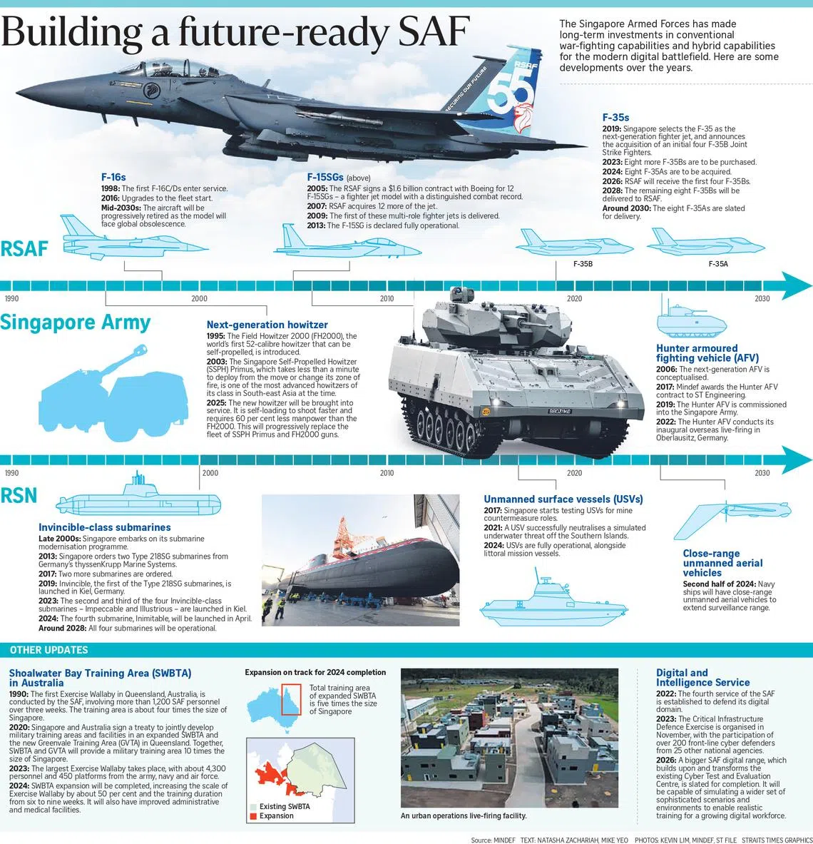 This includes the Safti City Phase 1 and three instrumented battle circuits at home. Abroad, an expanded Shoalwater Bay Training Area in Queensland, Australia, is nearly complete, which will allow the SAF to scale up its annual exercise there by close to 50 per cent, said Dr Ng.